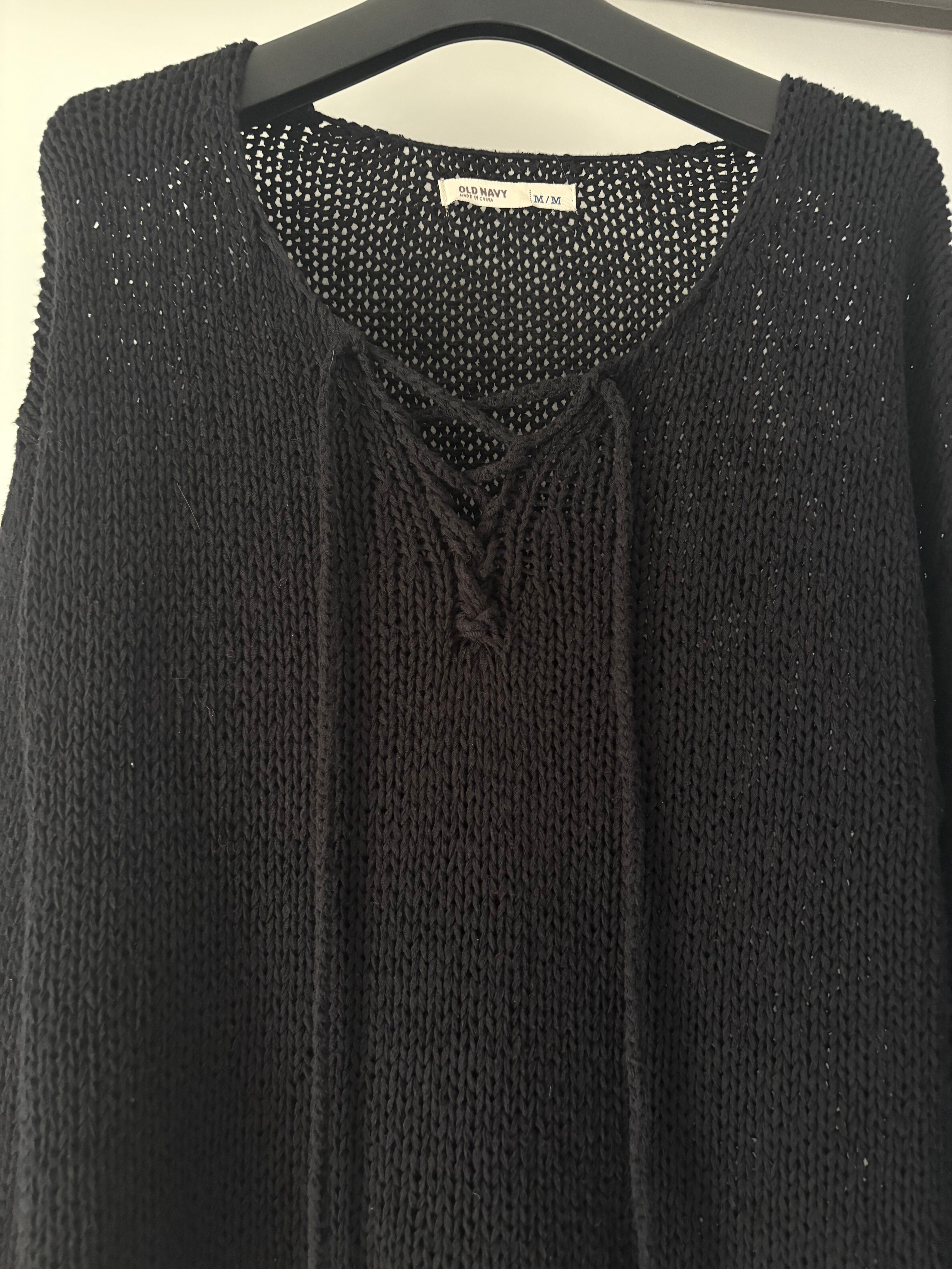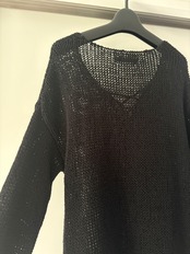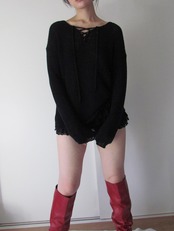 ブラックの透けニットは、夏の余韻を引きずりながら秋の夜風にちょうどいい。レースアップを少しゆるめて、気取らず羽織れば、夜はまだ終わらない。