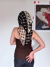 フランスやイタリアで、スカーフやネクタイを多く作っていたブランド“Lasserre"による、70'sのフレンチモダンを映したシルクスカーフ。艶やかなブラック×ベージュのドットは、光と影をまとって揺れるたびに色っぽい。