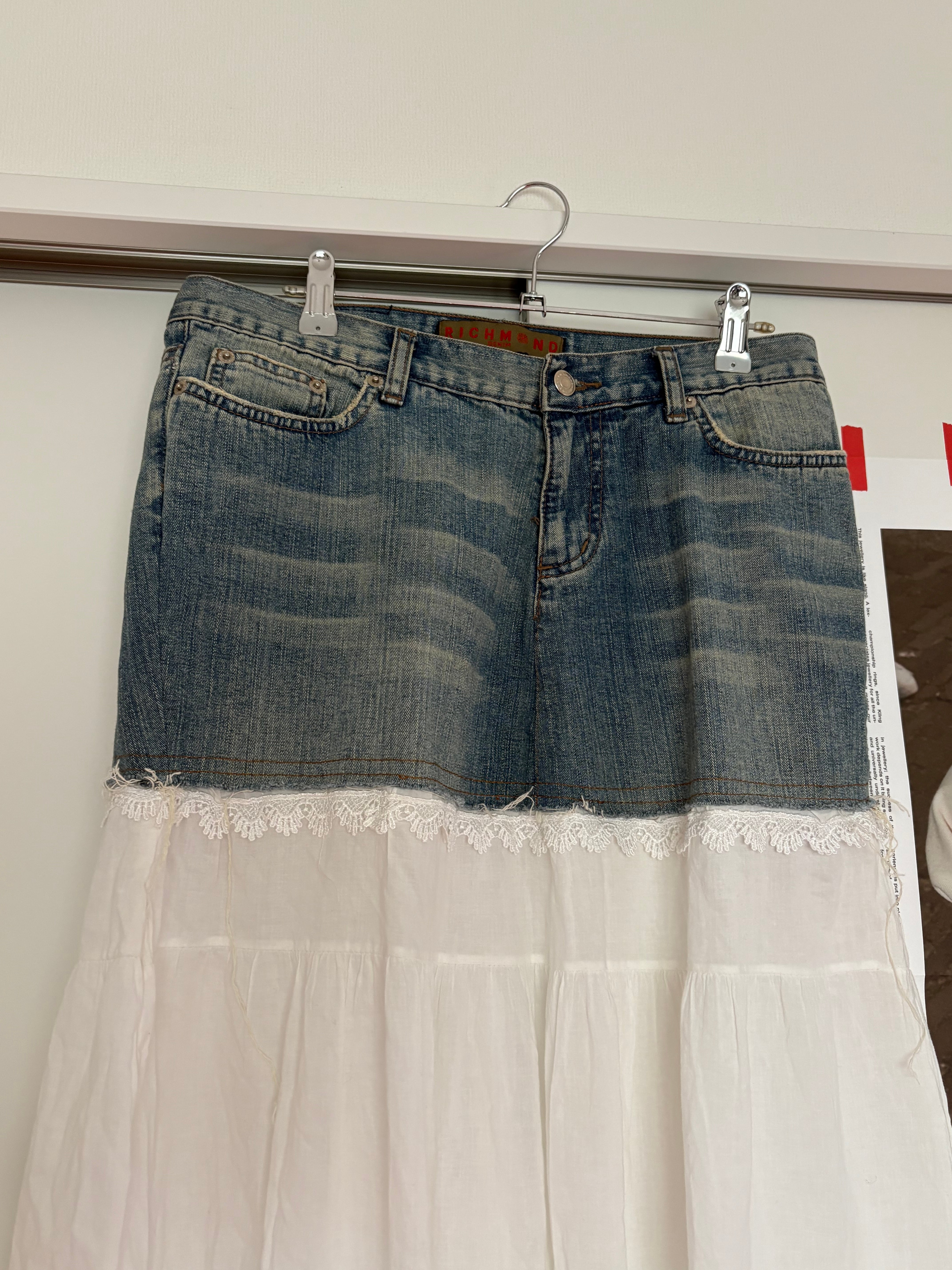 イギリスのロックデザイナーJohn Richmond が手がけたデニムライン、RICHMOND DENIMのY2Kドッキングスカート。甘いホワイトフリルの組み合わせが、ロックとガーリーを行き来する一枚。