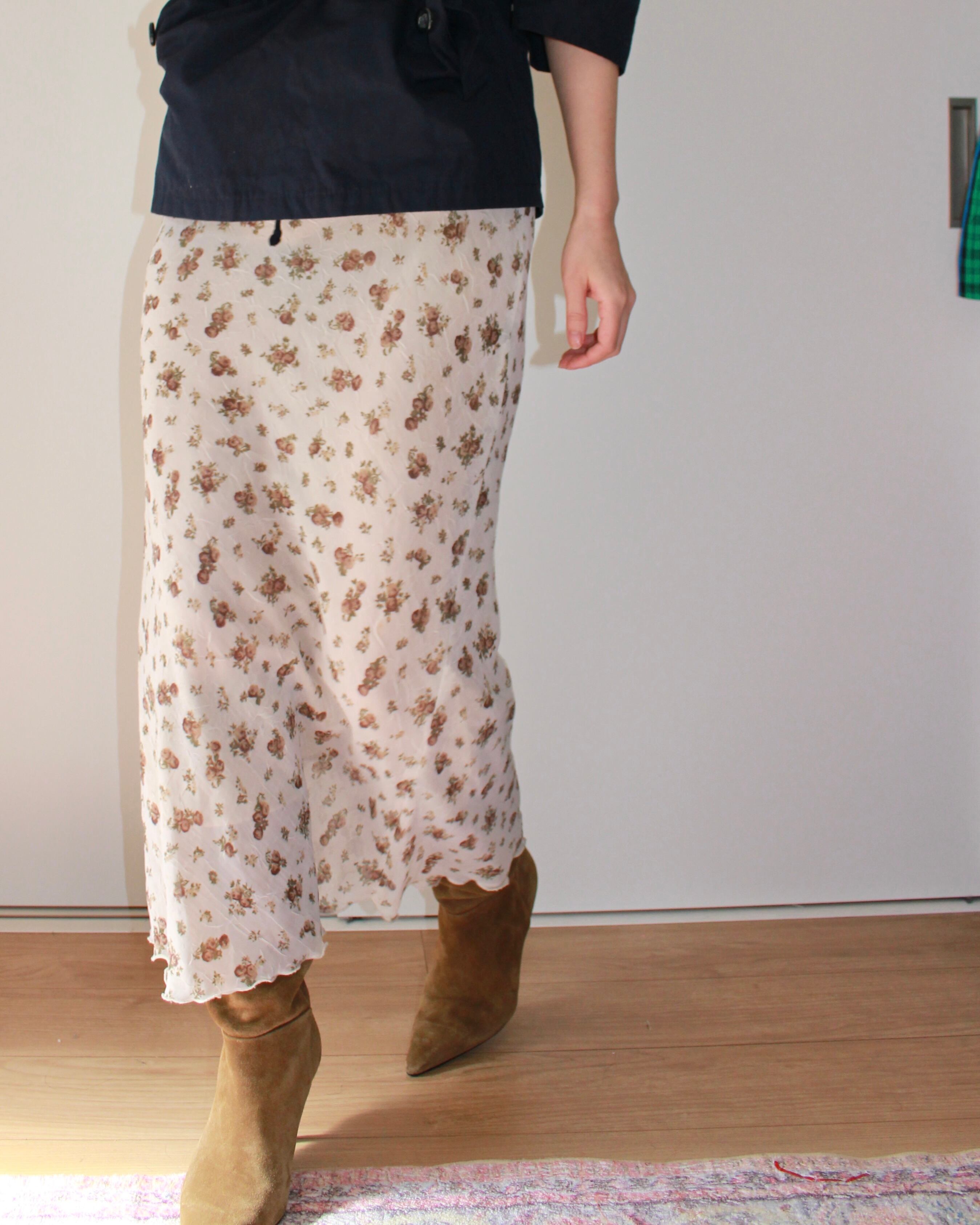 小さなバラが散りばめられた、透け感のあるフラワースカート。