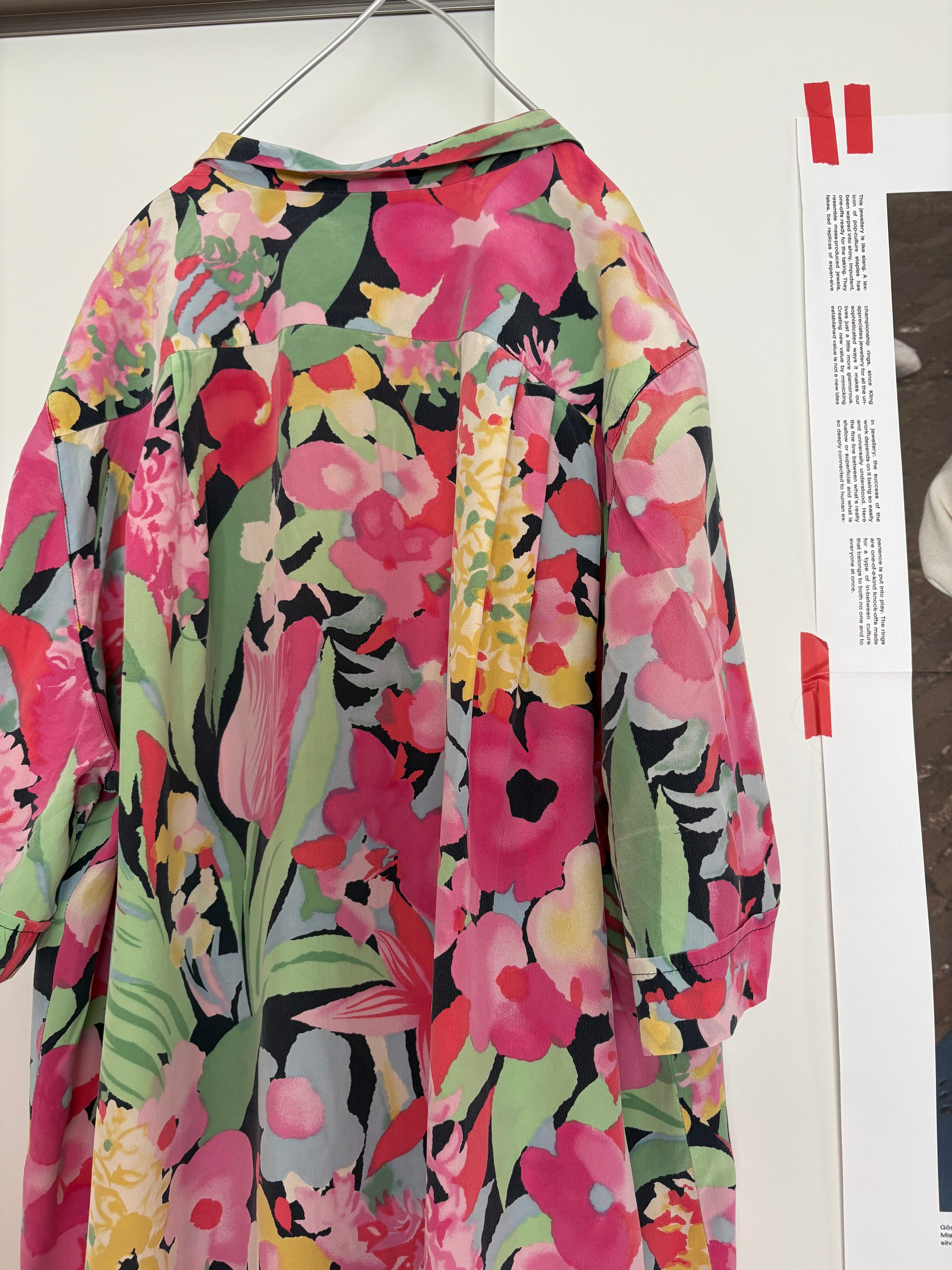 80'sフランス製Ungaro solo donnaのヴィンテージワンピース。とろみのある軽やかな素材が心地よく、動くたびにふわっと揺れるシルエット。大胆なフローラルパターンが視線を惹きつける、華やかでロマンティックな一着。