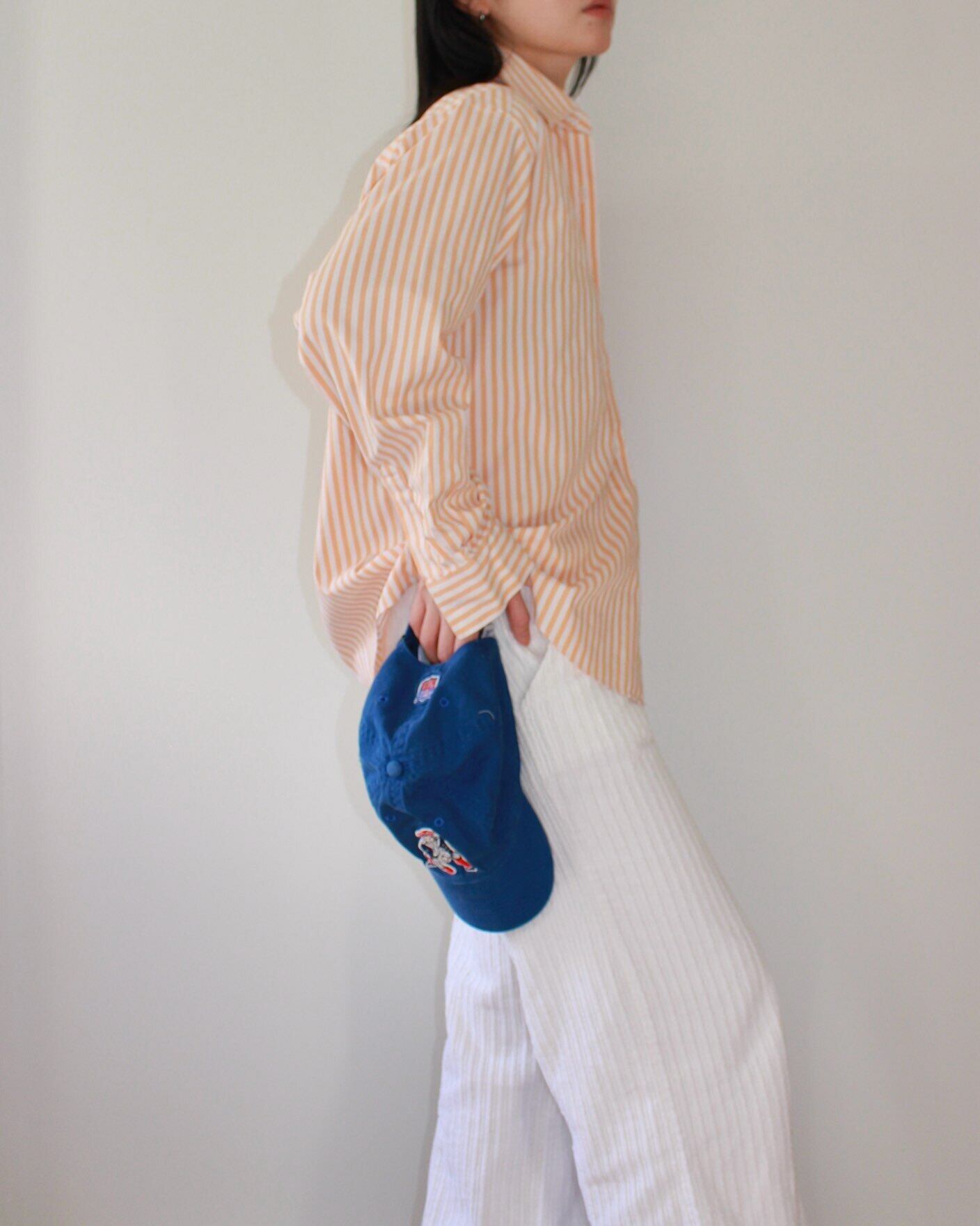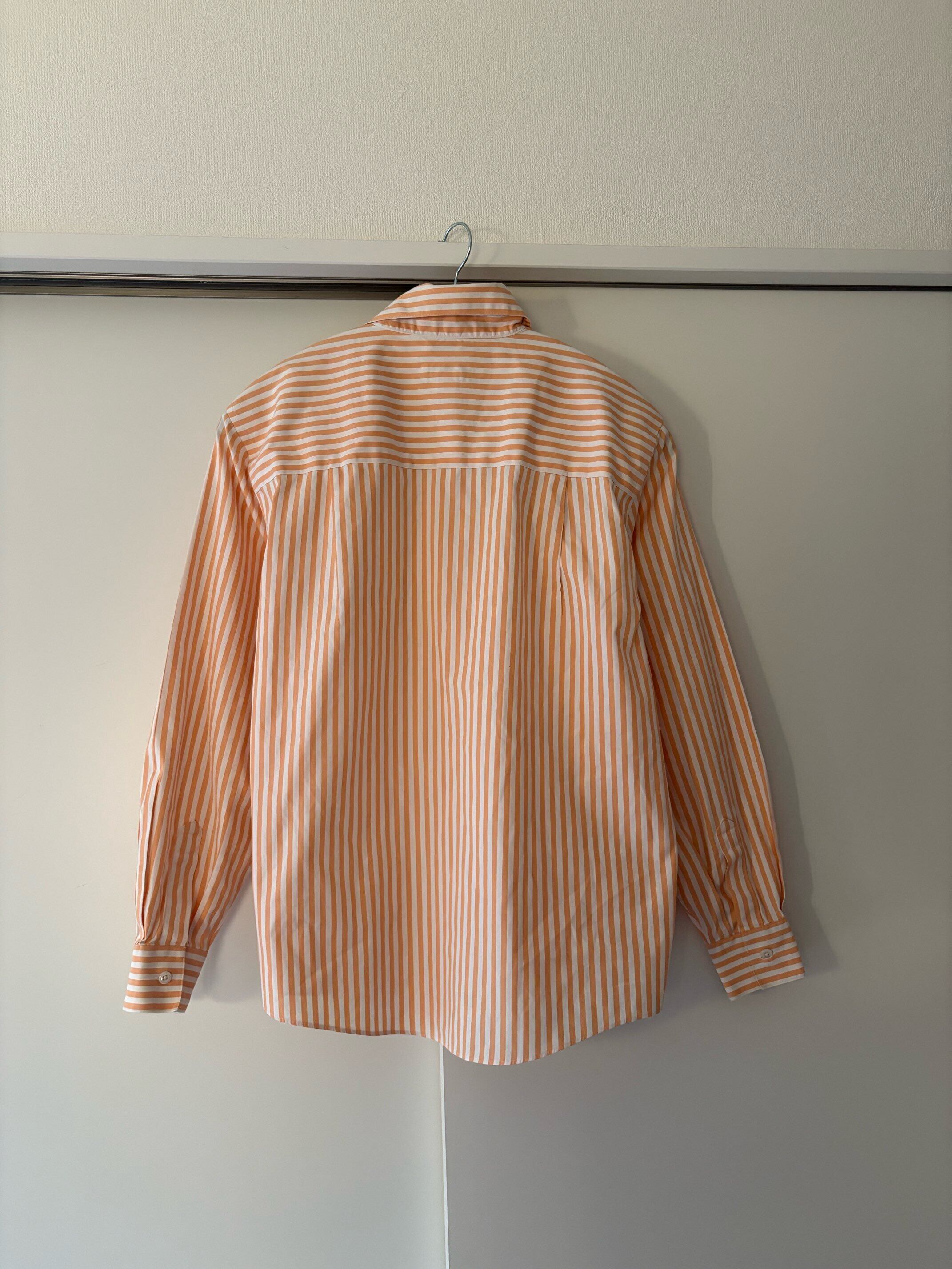 やわらかなピーチカラーに、細いホワイトストライプ。きちんと感はあるのに、どこか肩の力が抜けた一枚です。