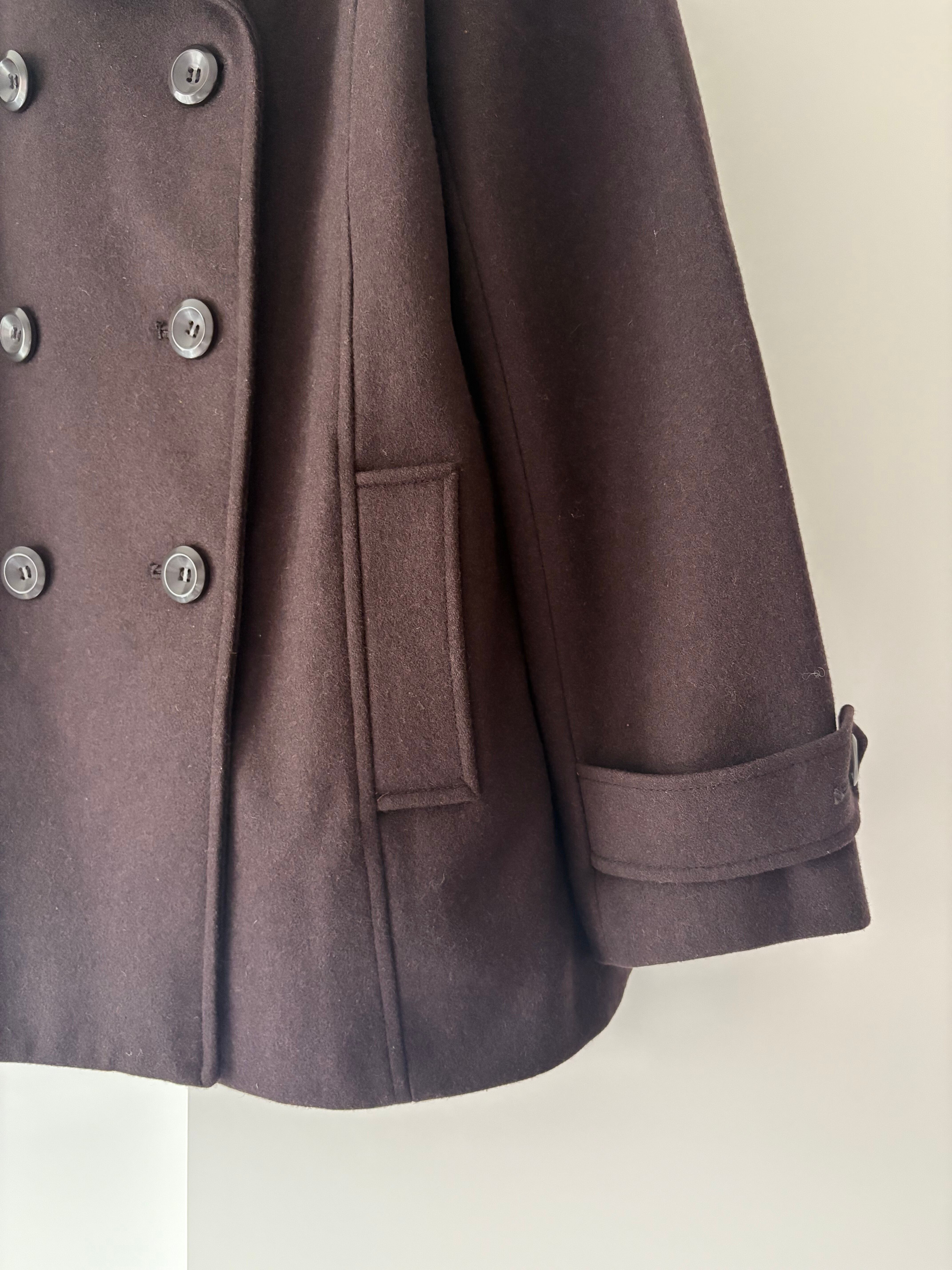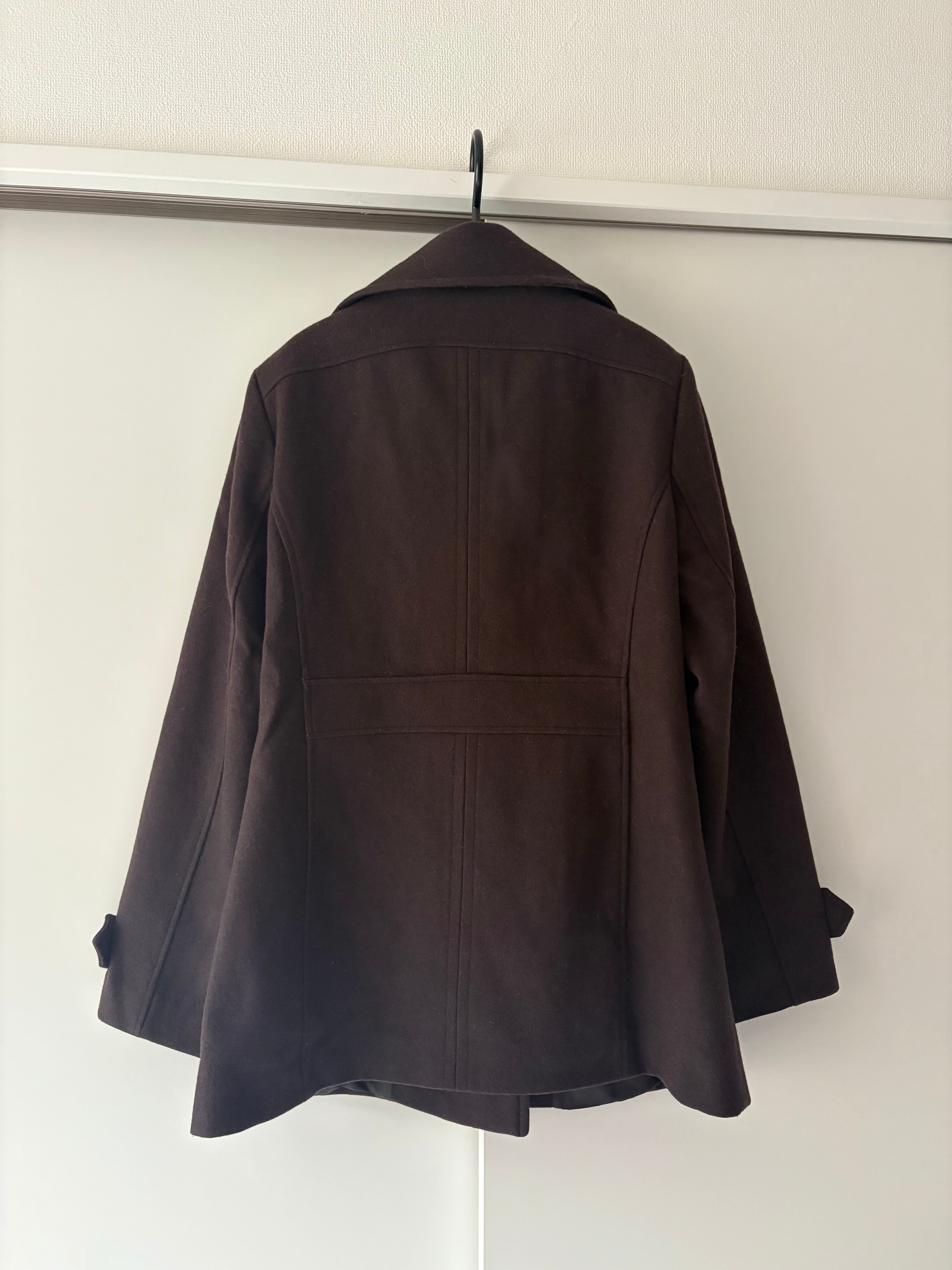 冬の街に、あたたかい影を落とすココアブラウン。大きめの襟とダブルボタンがクラシックな雰囲気をつくり、しっかりとした生地感が風をやさしく受け止める。