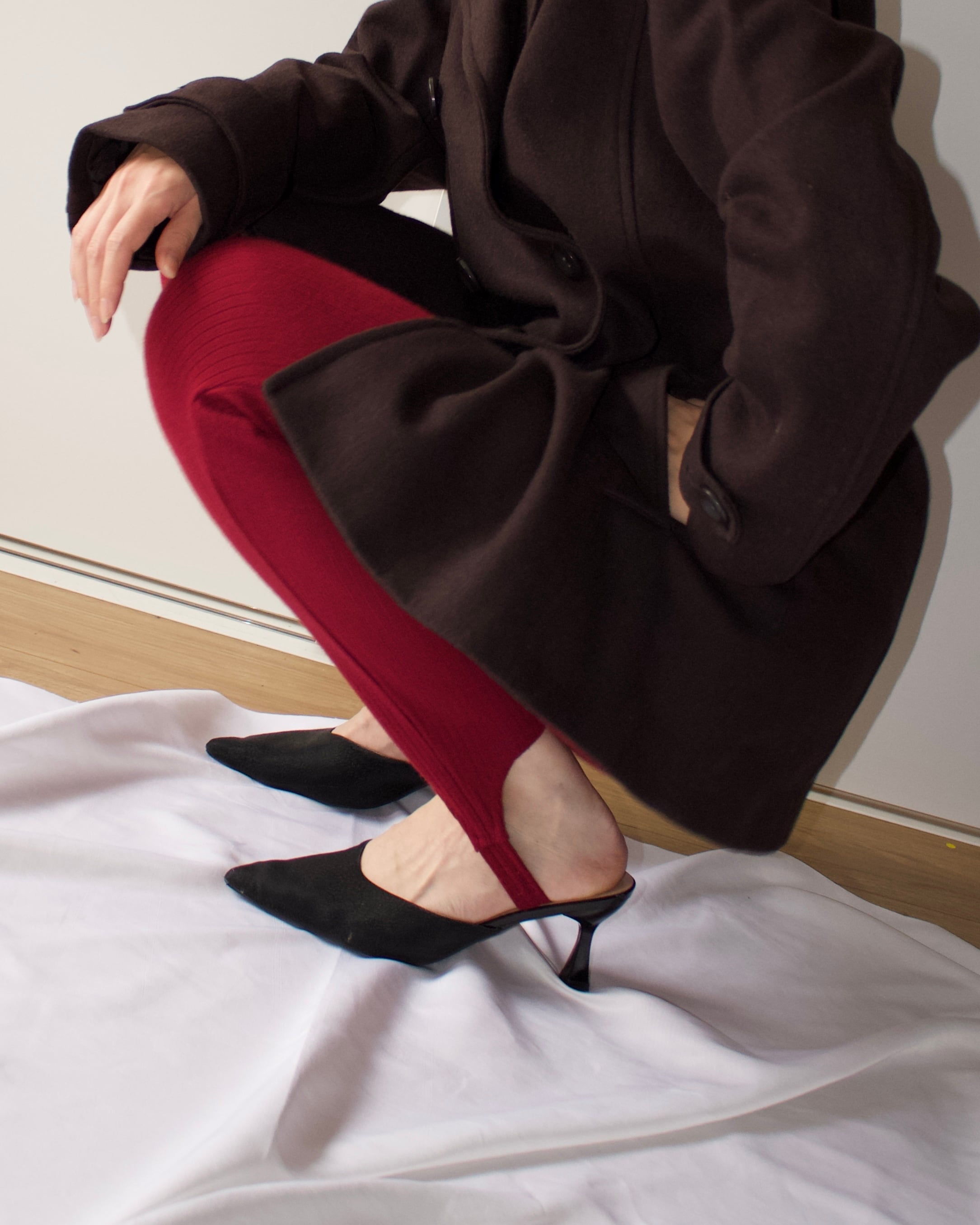 柔らかく伸びのあるリブ素材が脚にやさしく沿い、華奢なストラップがシルエットをより美しく引き立てます。