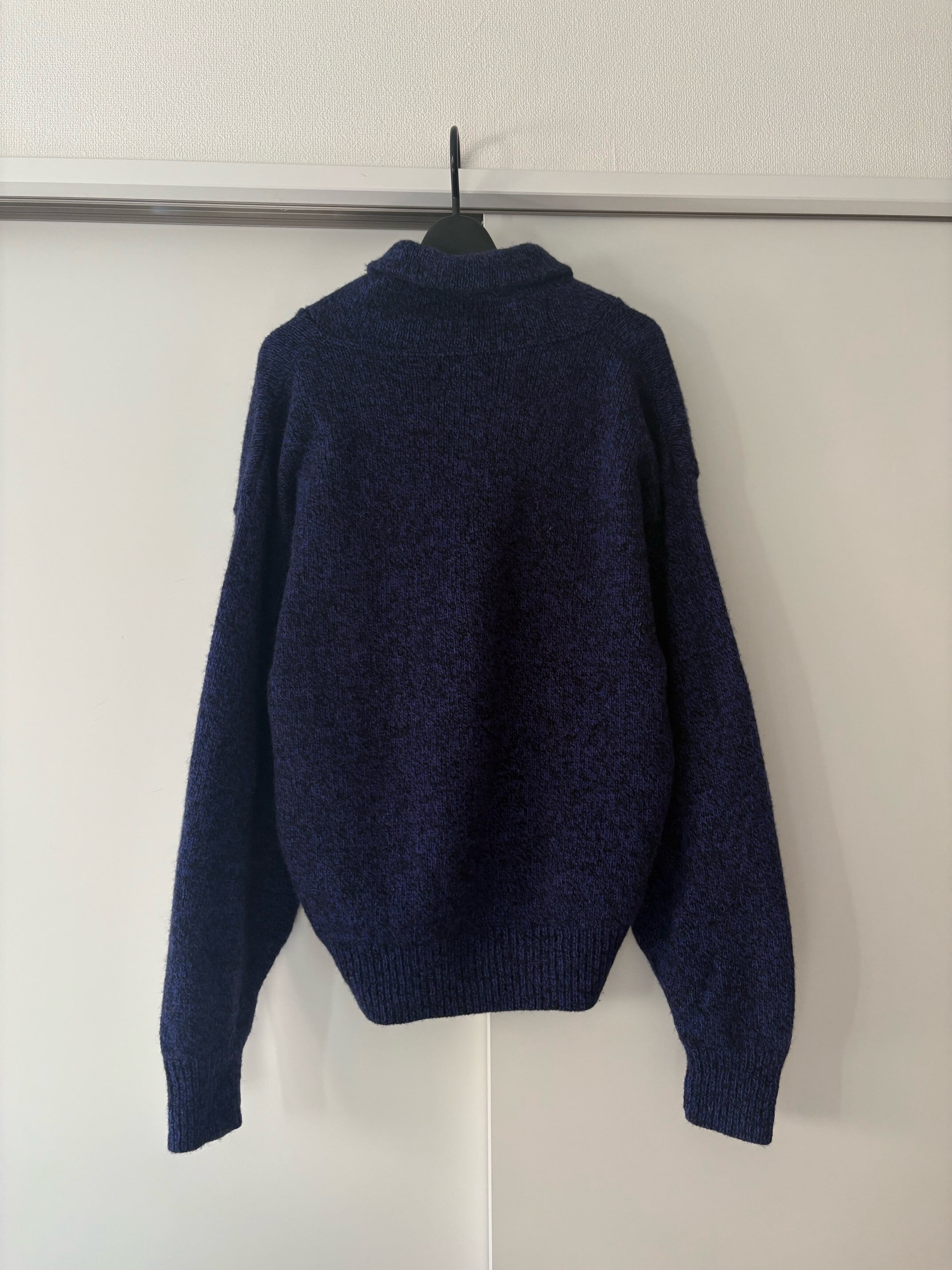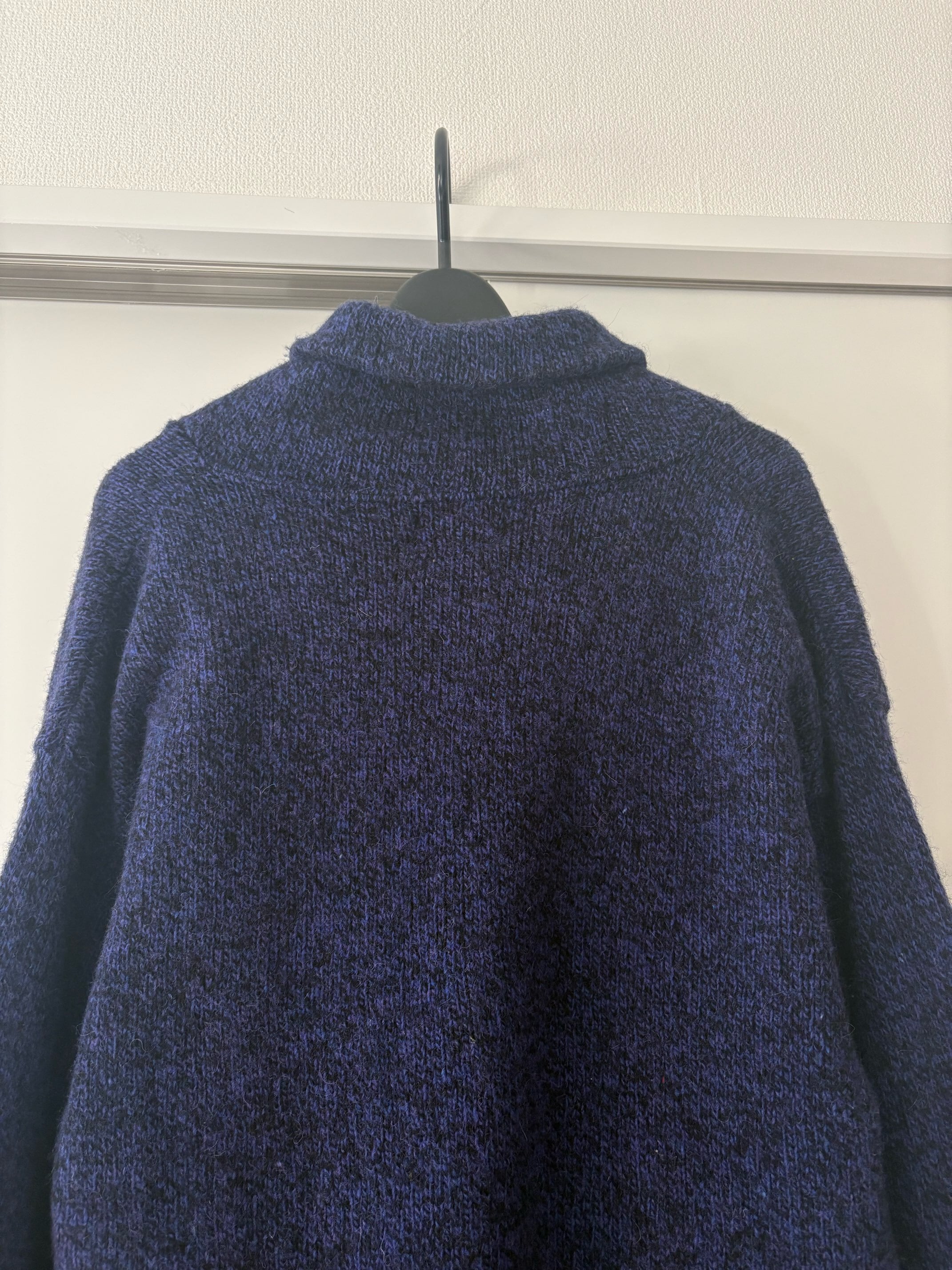深いブルーに黒が少し混ざった、夜の海みたいな色合いのショールカラーニット