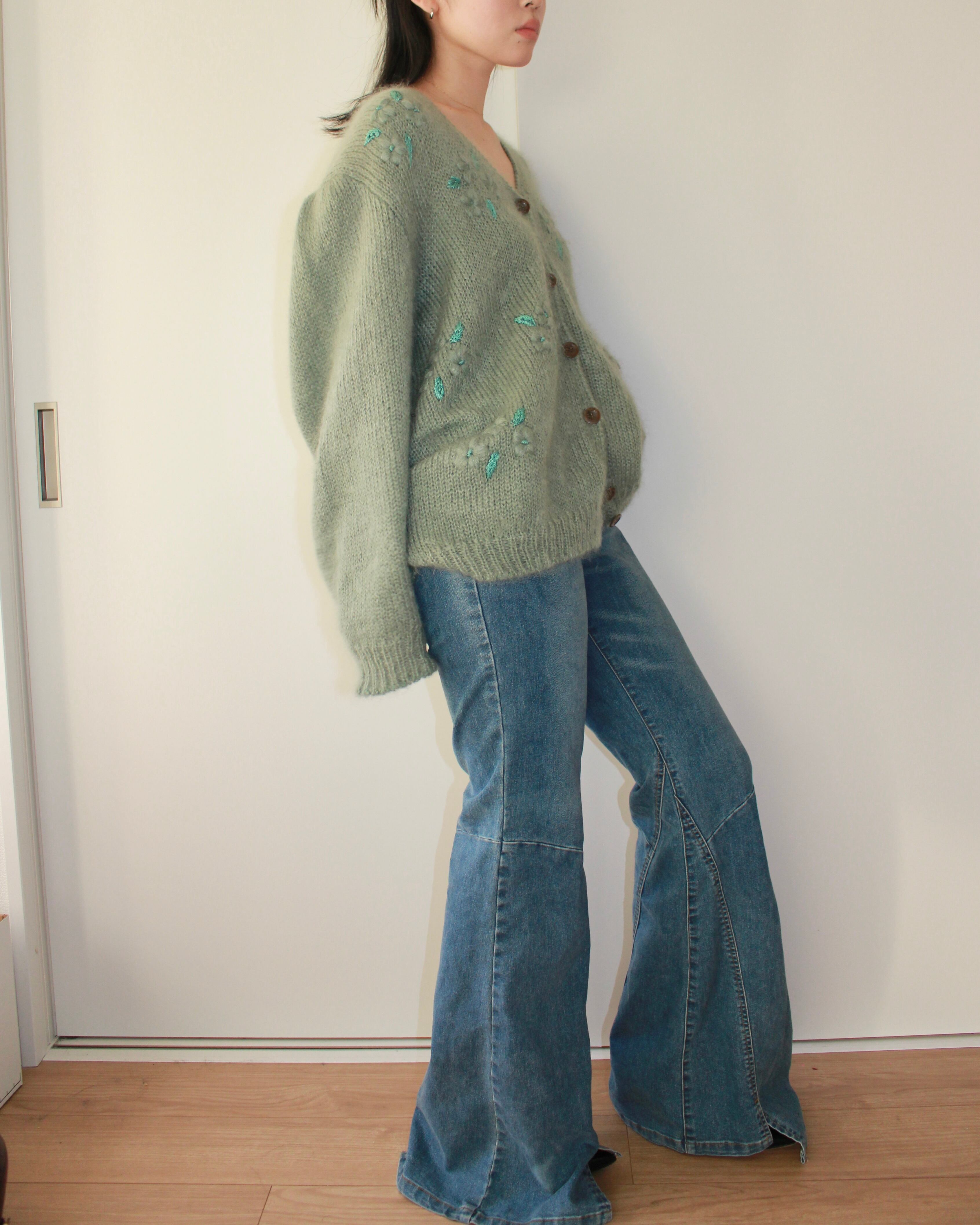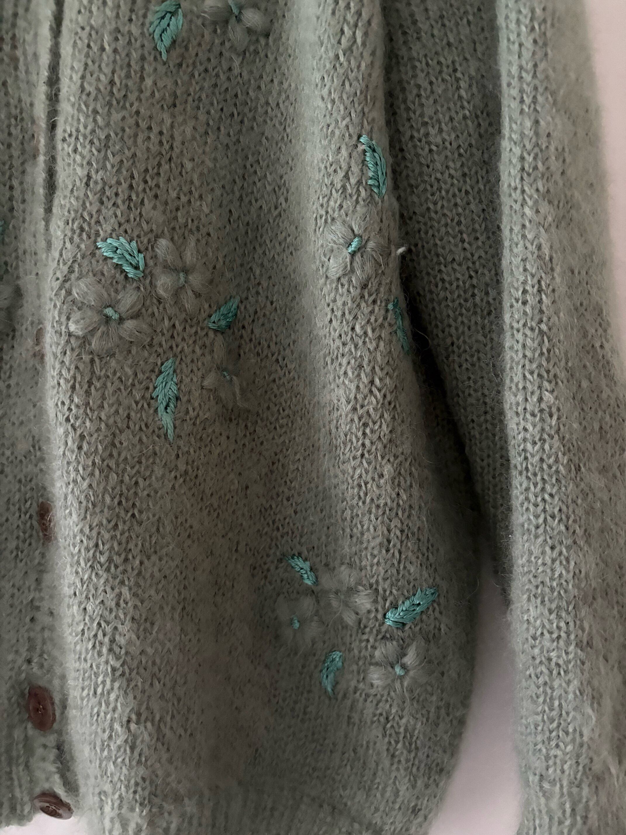 やわらかなセージグリーンのニットに、手刺繍の小さな花がそっと咲くヴィンテージカーディガン