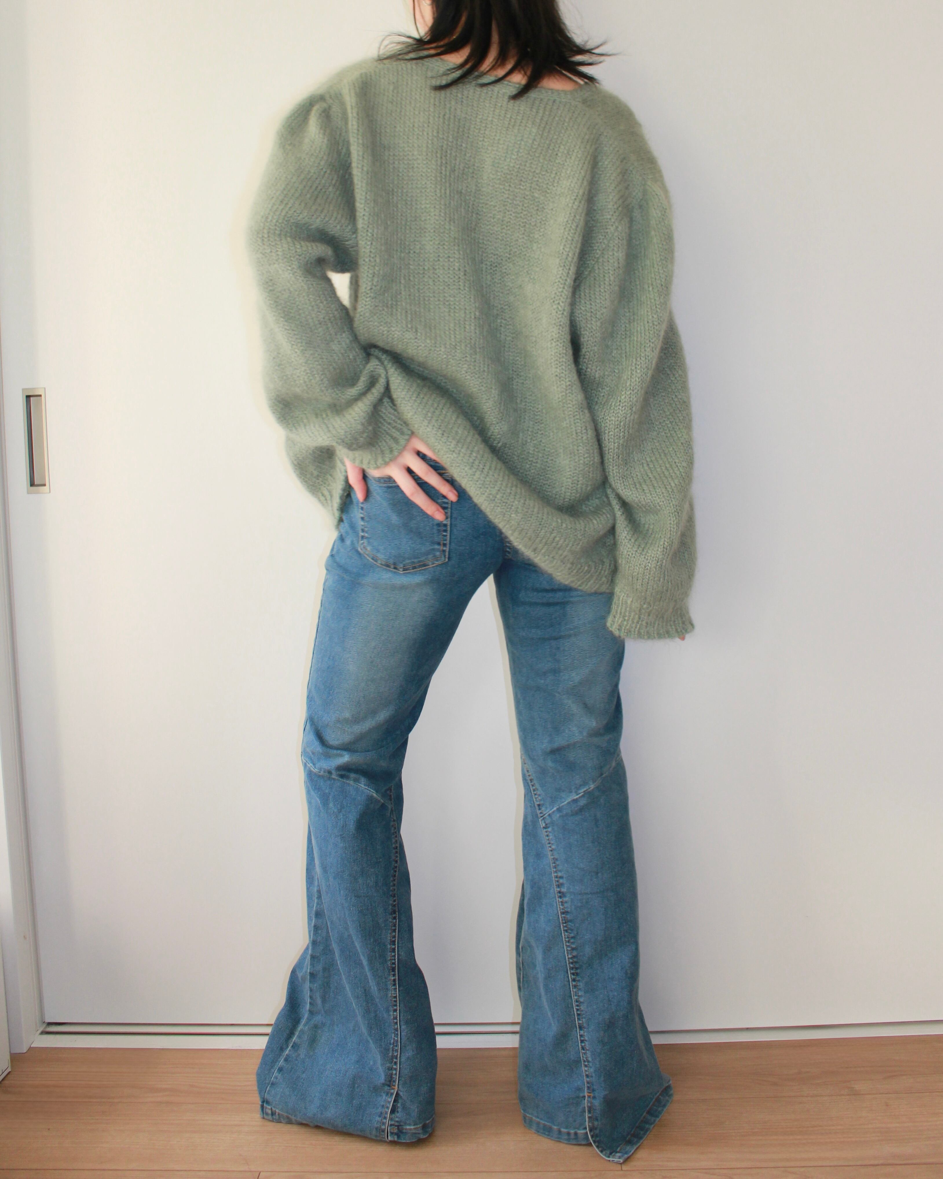 編み地は少し甘く、モヘア混の糸がふんわりと空気を含んでいます。触れると軽くて、肌にのせるとやさしくあたたかい質感。