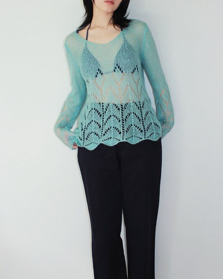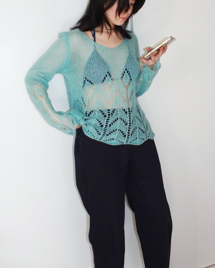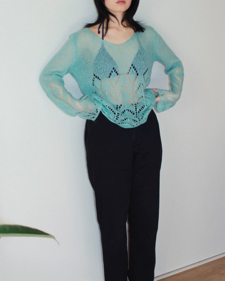 1970年代後半につくられたとみられる、繊細な透かし編みのニット。編み目のわずかな揺らぎや、きっちりしすぎない仕上がりから、当時のハンドクラフトの空気を感じさせます。