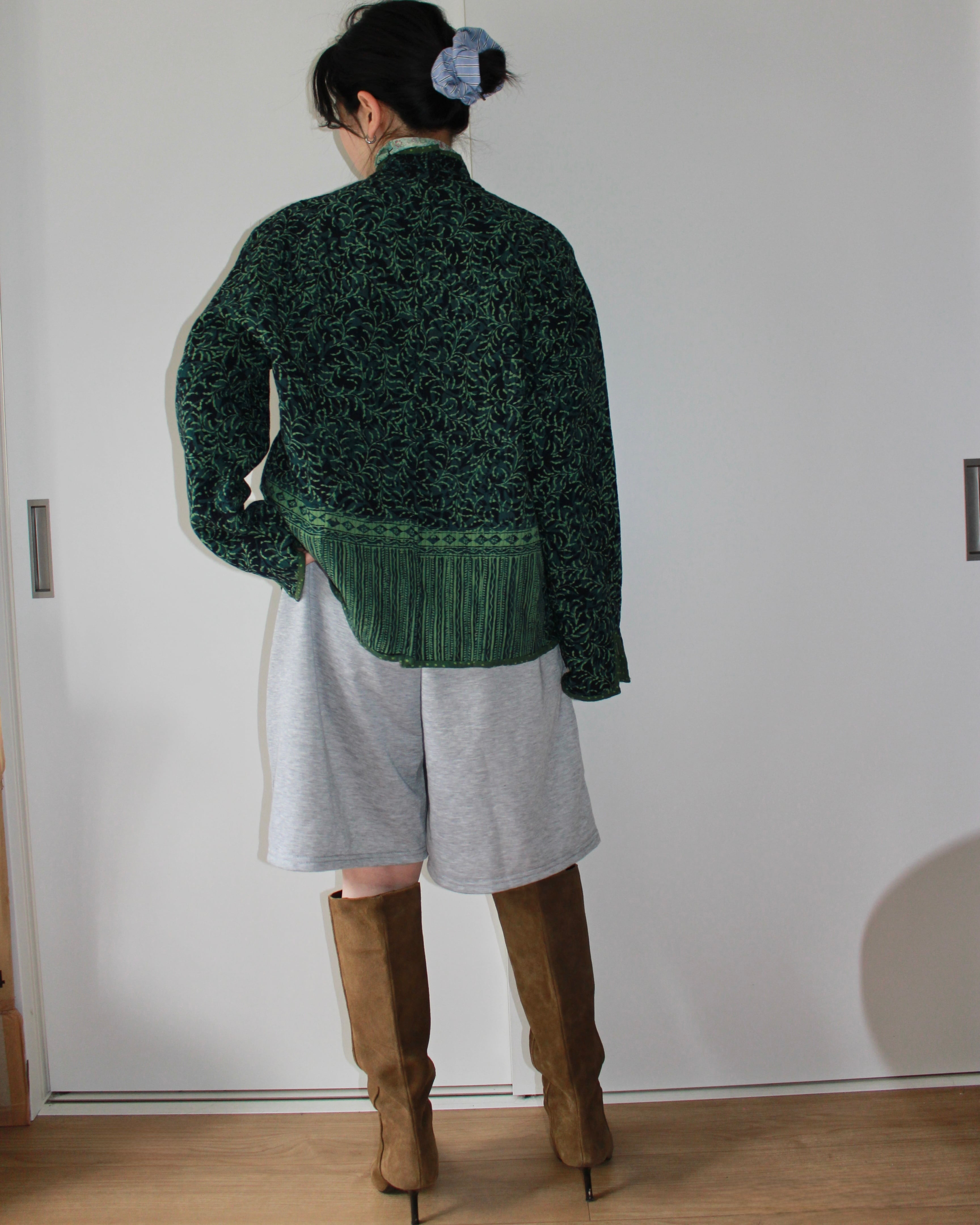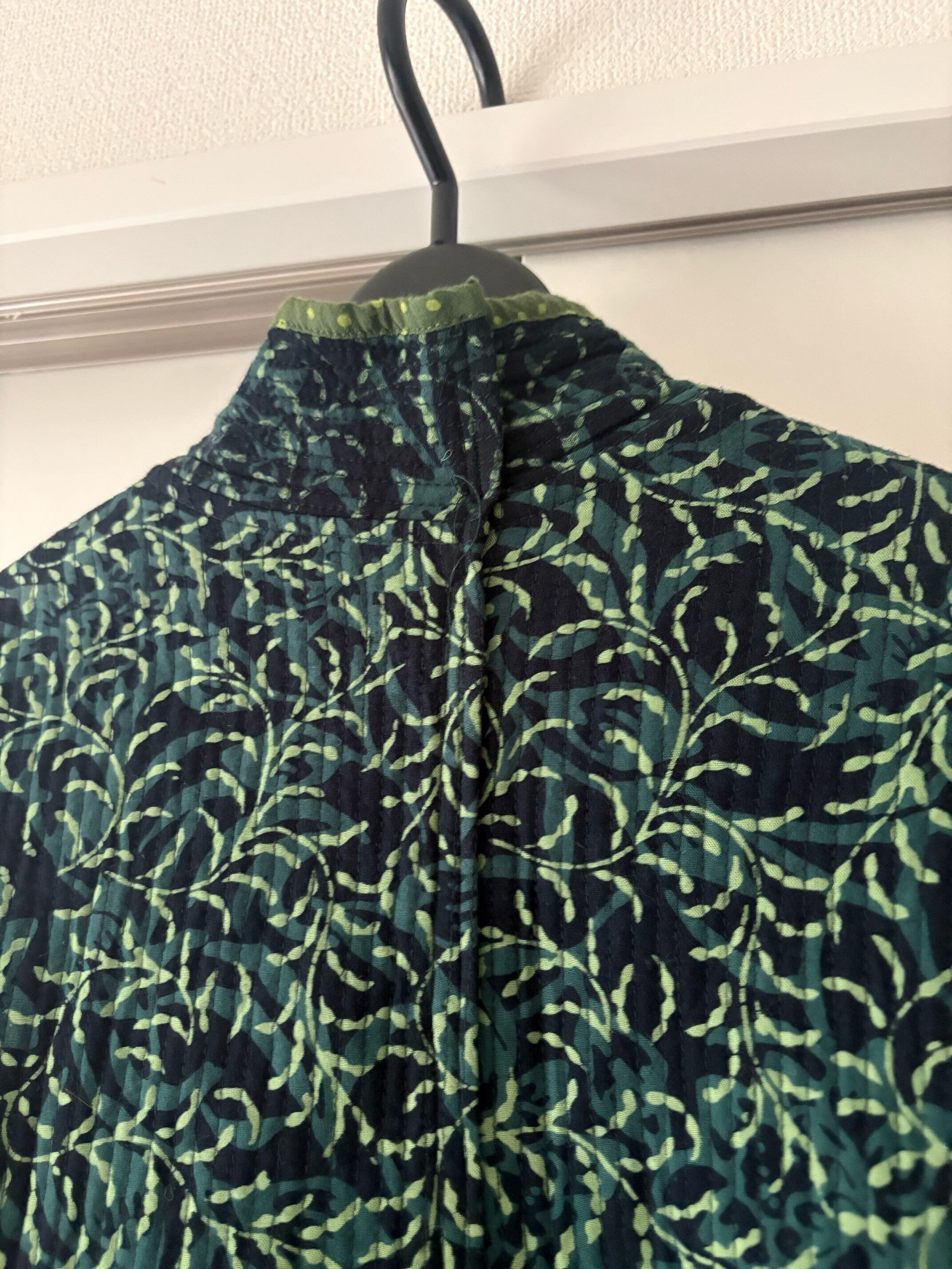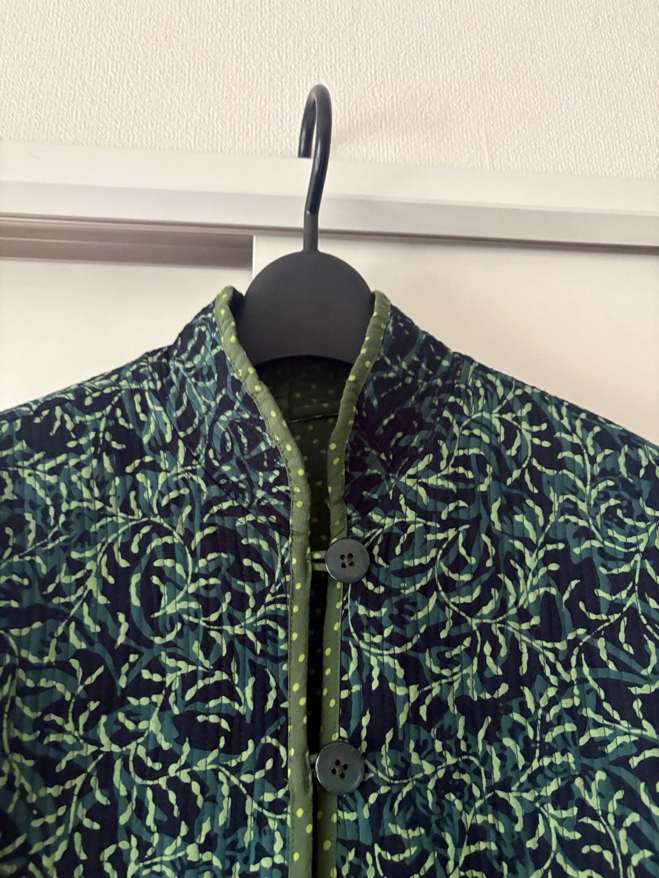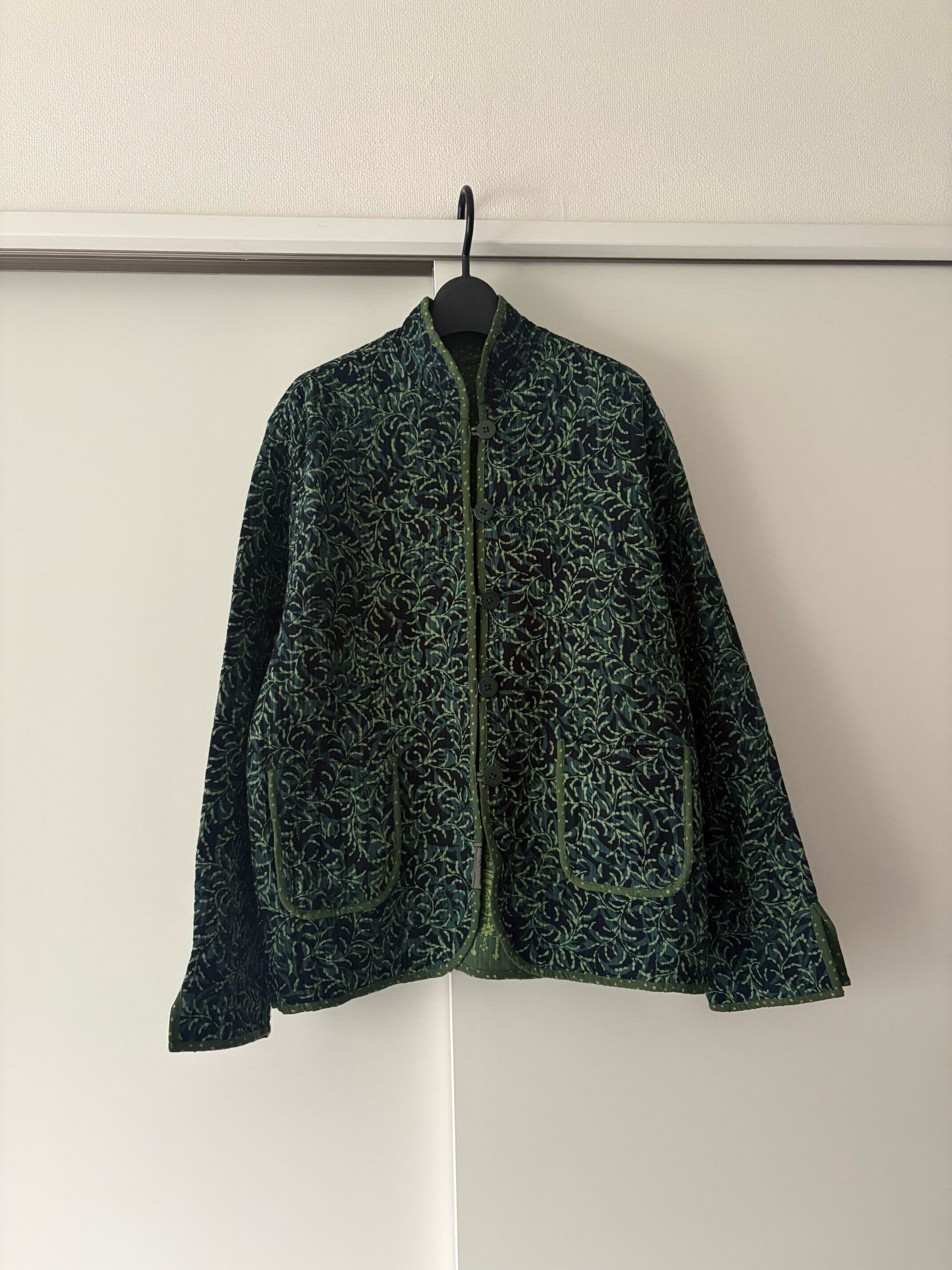 深いグリーンのキルティングジャケット。森のような柄が印象的な一枚です。