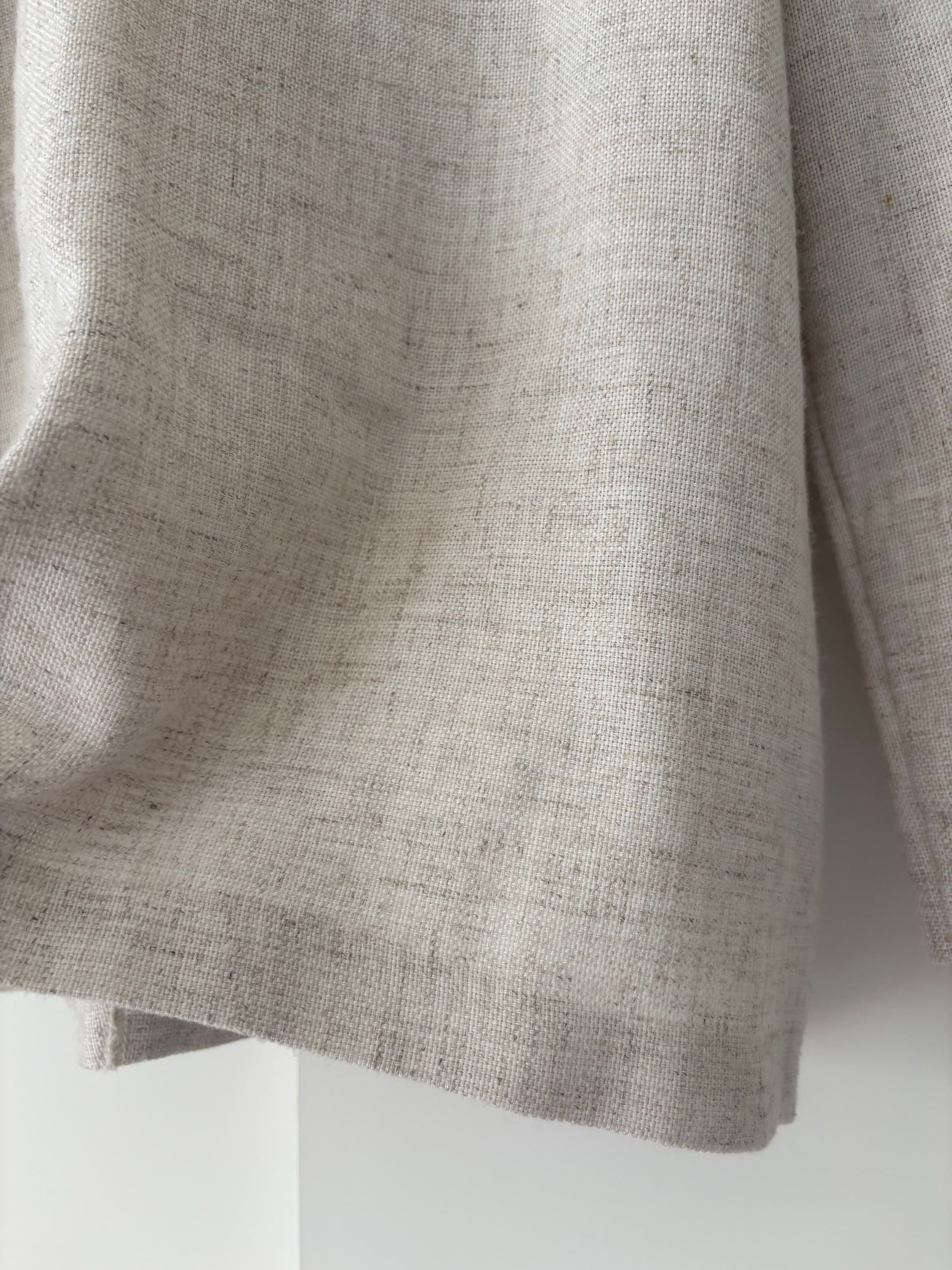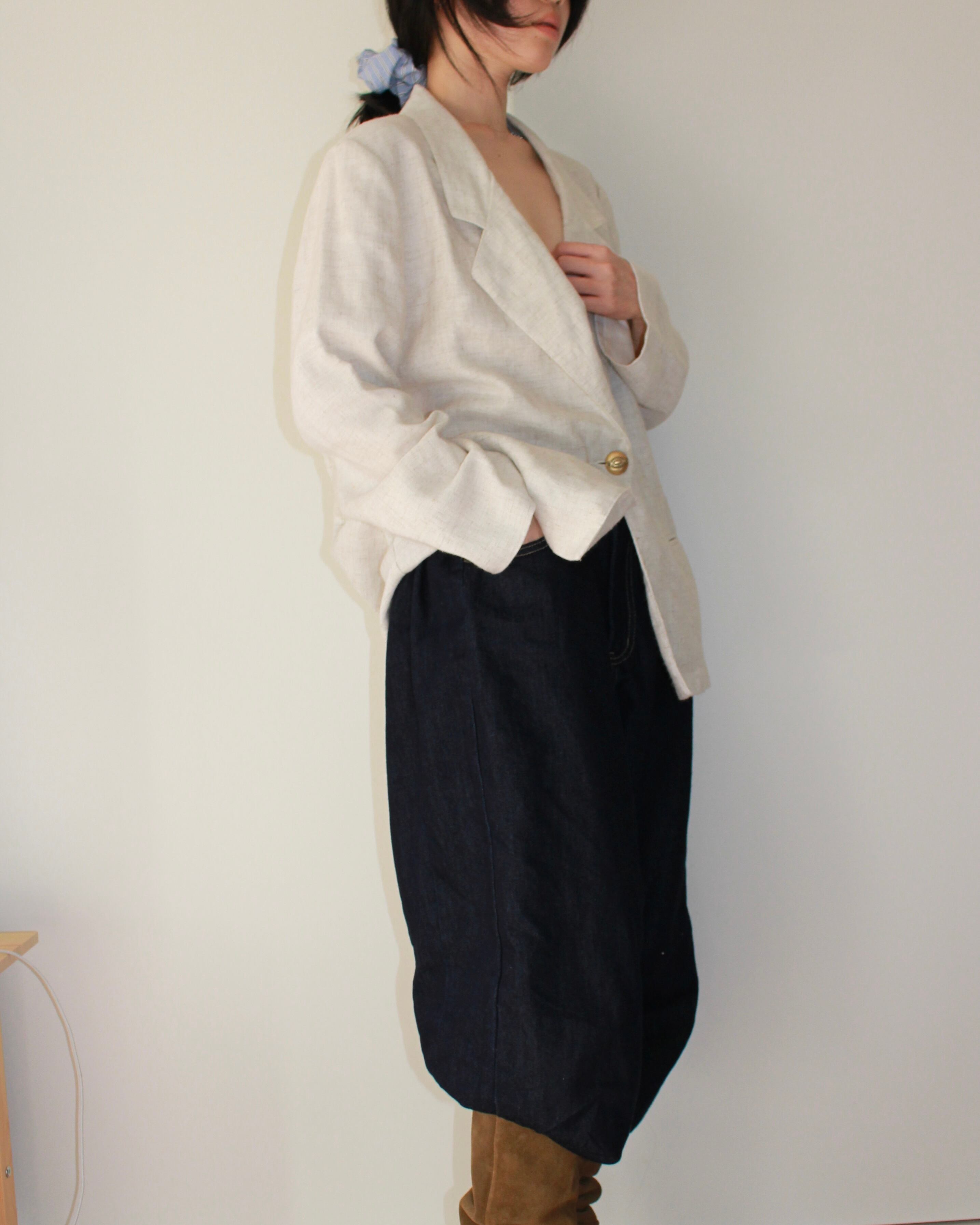 さらっとしたナチュラルな生地と、すっきりしたワンボタンのシルエット。きちんと見えるけど、どこか力の抜けた雰囲気が魅力です。