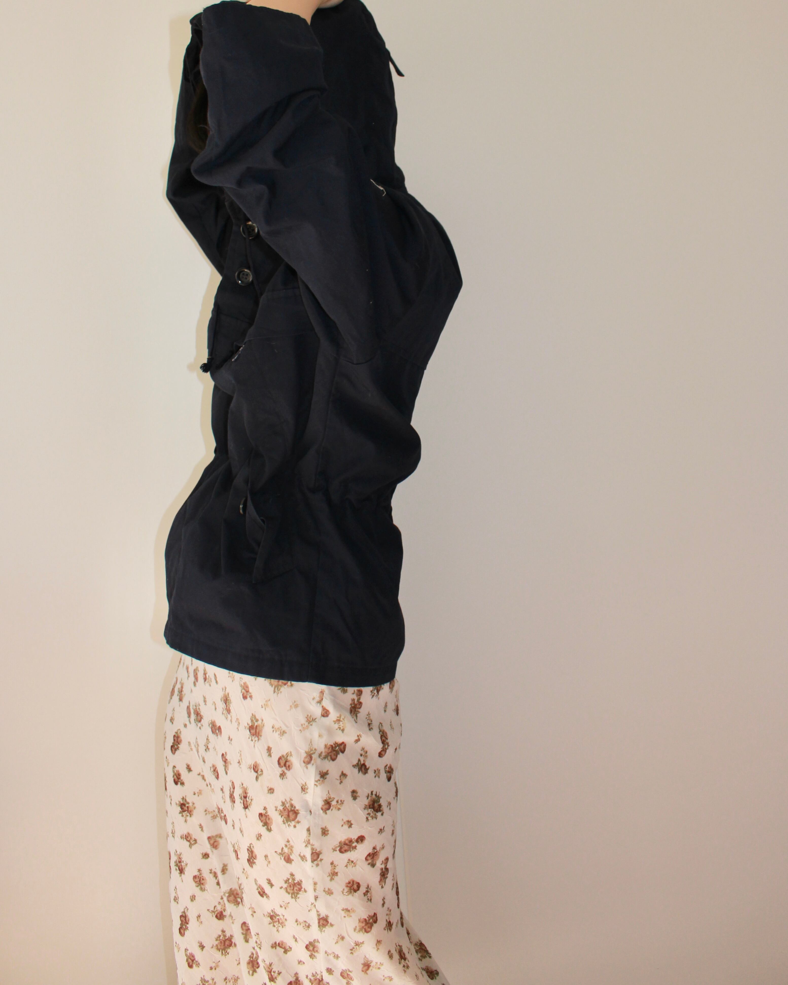 深いネイビーの落ち着いた色と少しコンパクトなシルエット。ウエストはドローコードで絞れるので、ラフな中にも少し女性らしいシルエットに。