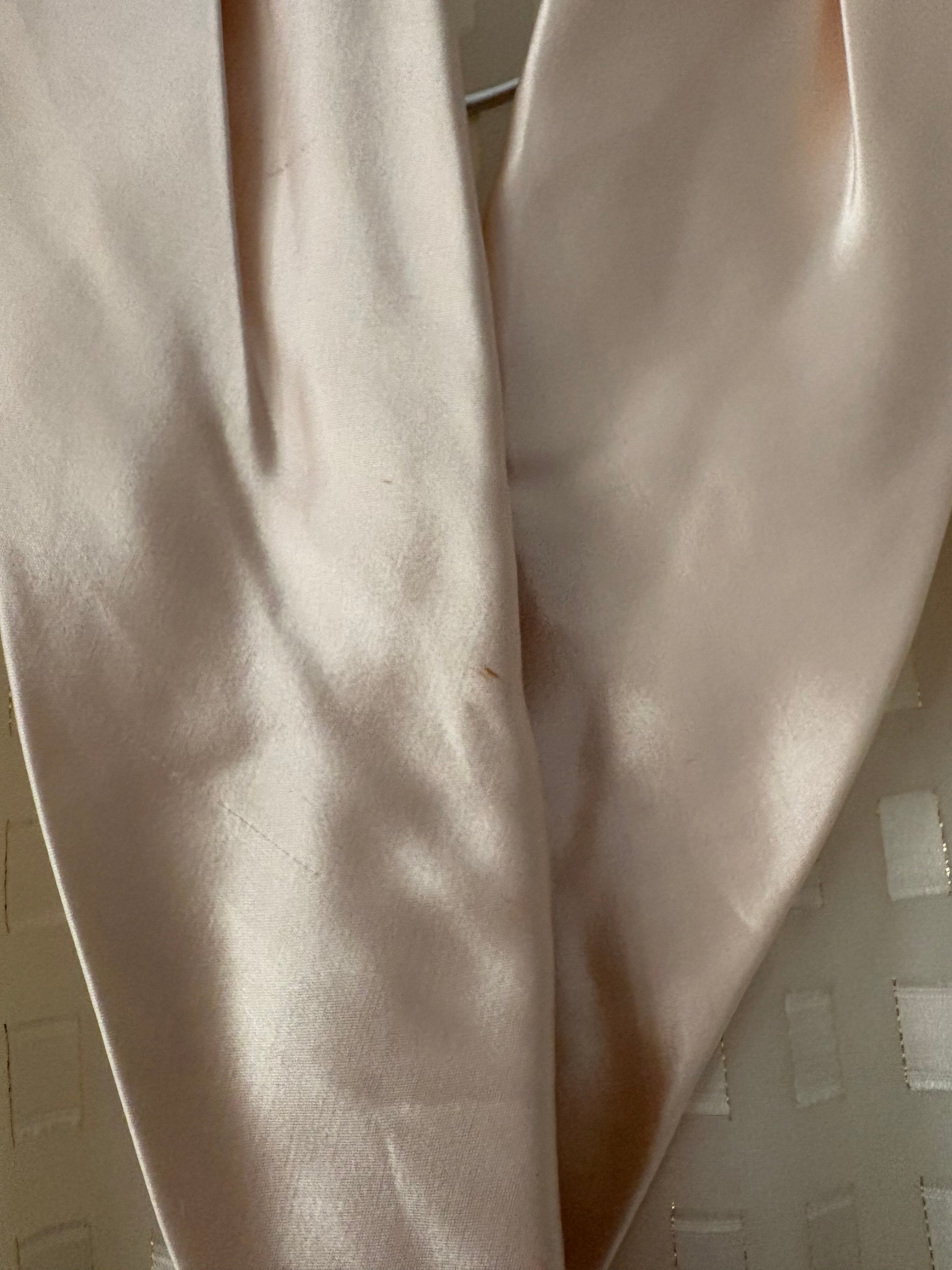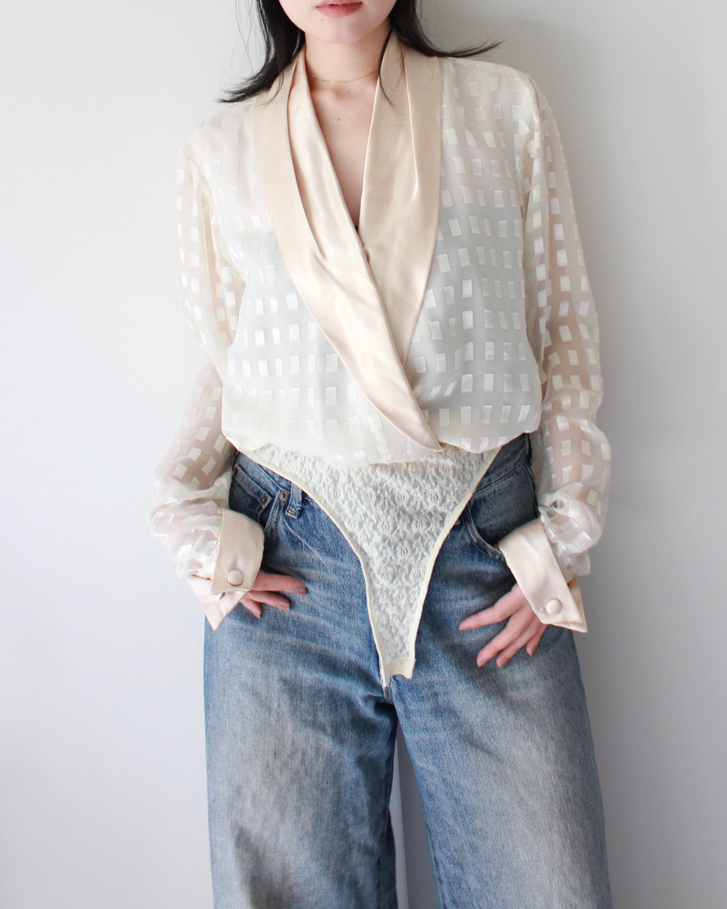 わらかなシャンパンカラーのショール形カラーに、ほんのり透けるスクエア模様のシアー素材。