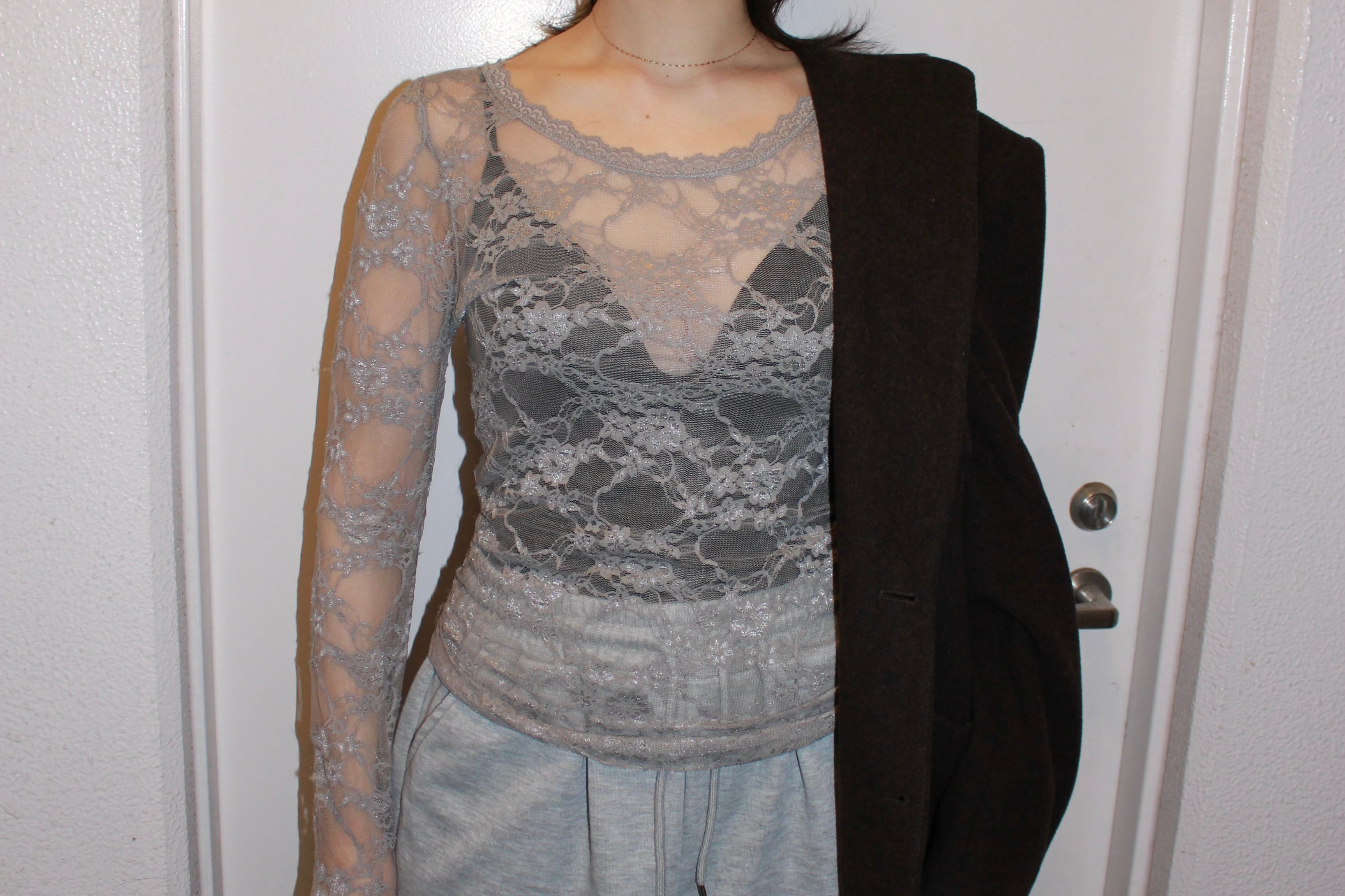 繊細なグレーのレースに包まれた、静かな一枚。主張は強くないのに、どこか目を引く存在感があります。
