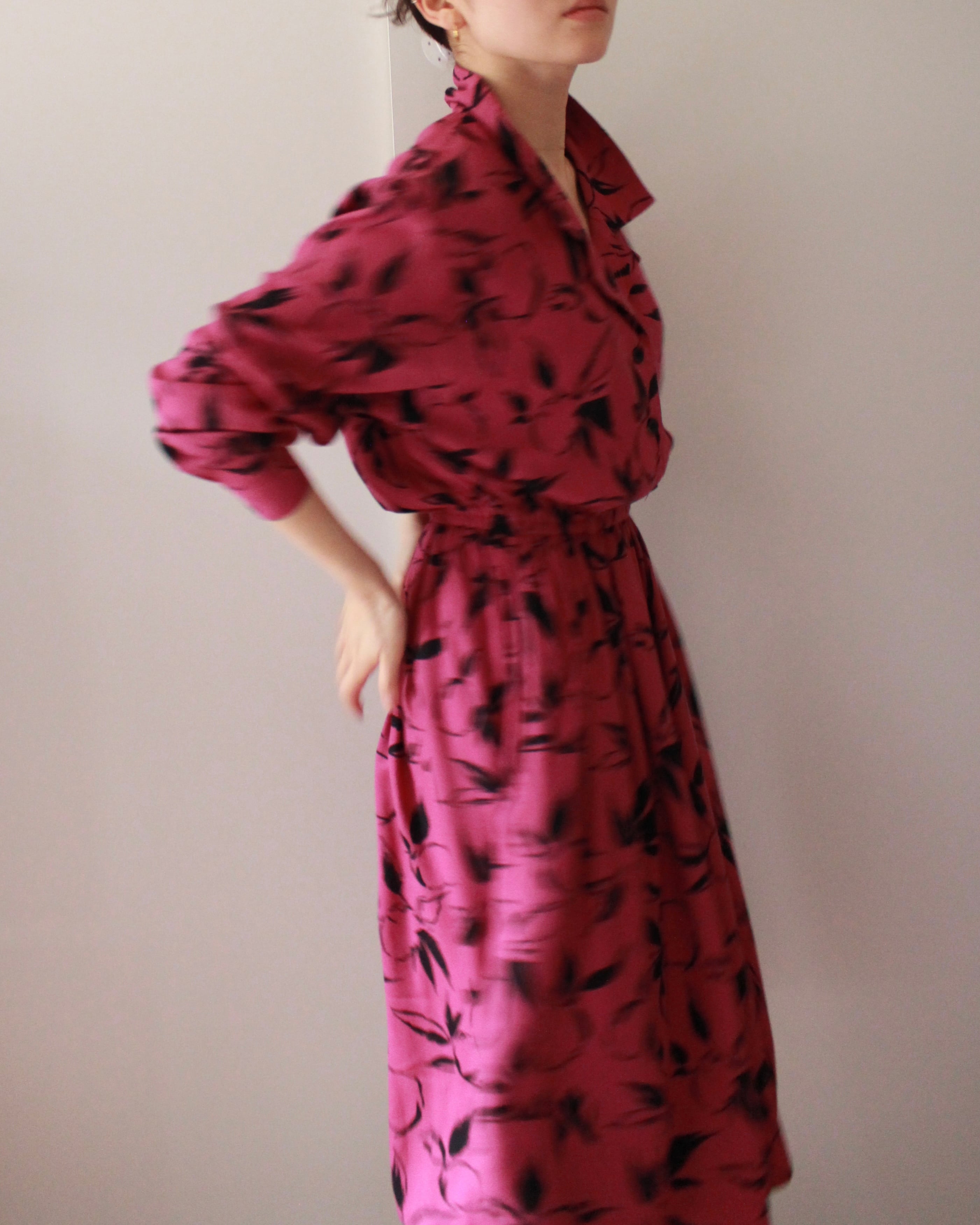 鮮やかなピンクにブラックのボタニカル柄が入ったワンピース。