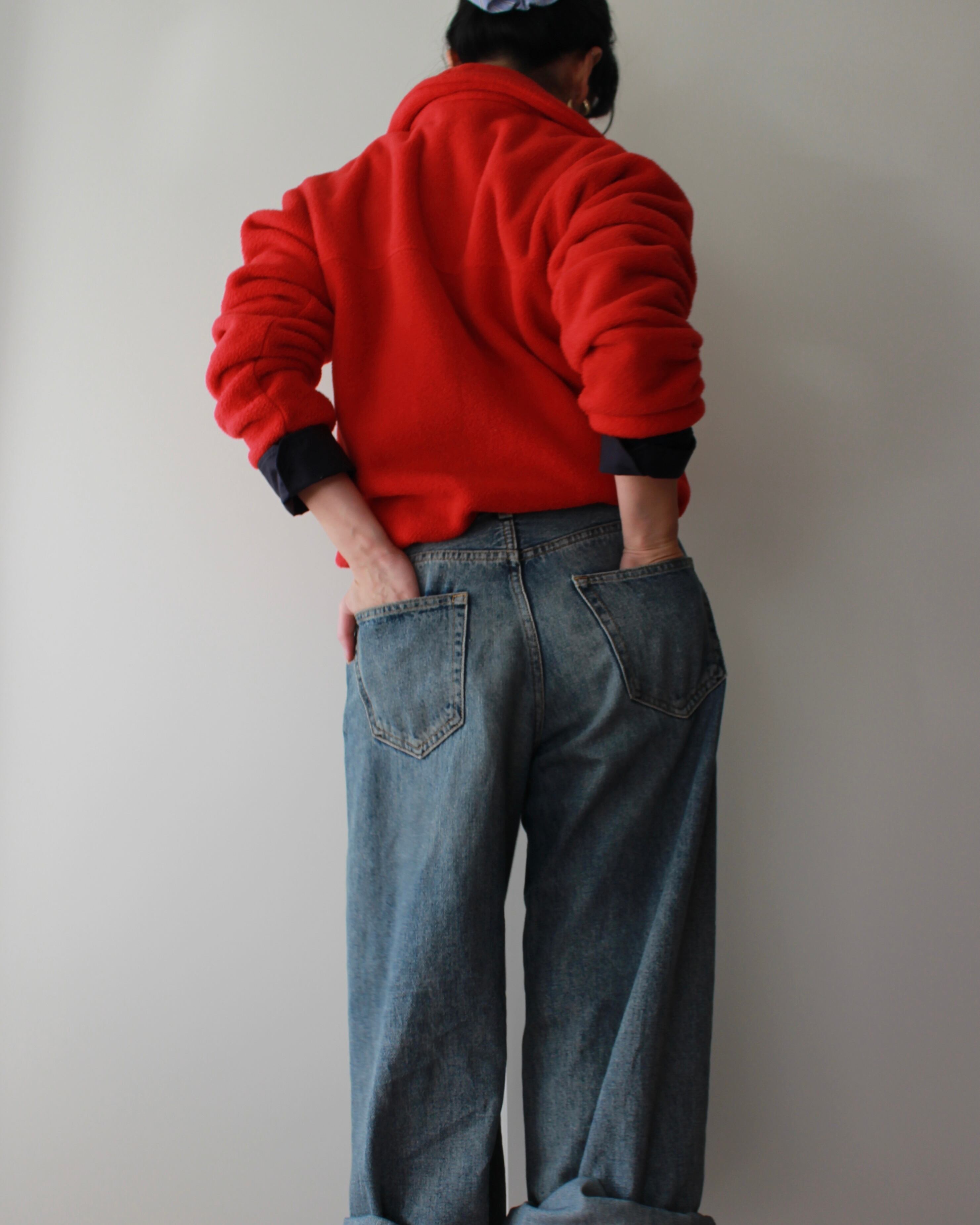 コンパクトなSというよりは、90s特有のちょっとだけ余裕のあるシルエットです。肩はすっきり、身幅はほんのりゆるく。ロンTや薄手ニットの上に羽織ると、ほどよく抜け感が出るバランス。