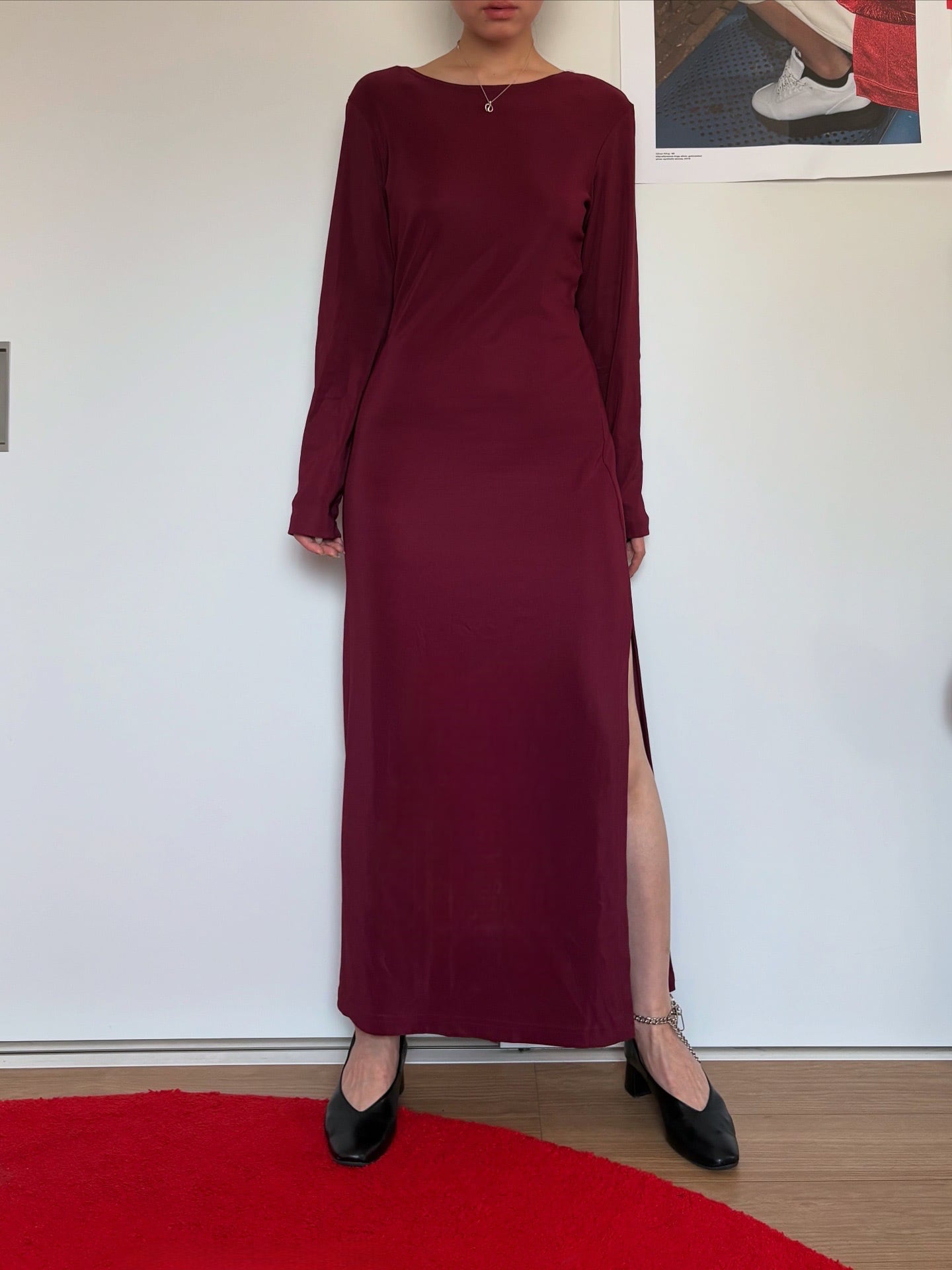 無駄のないシンプルなロングスリーブデザインに、深いワインレッドの色味が大人っぽさをプラス。伸縮性のある素材が体にすっと馴染み、片側のスリットがさりげなくセクシーさを引き出してくれます。シンプルなのに一枚で雰囲気が決まる、頼れる一着。