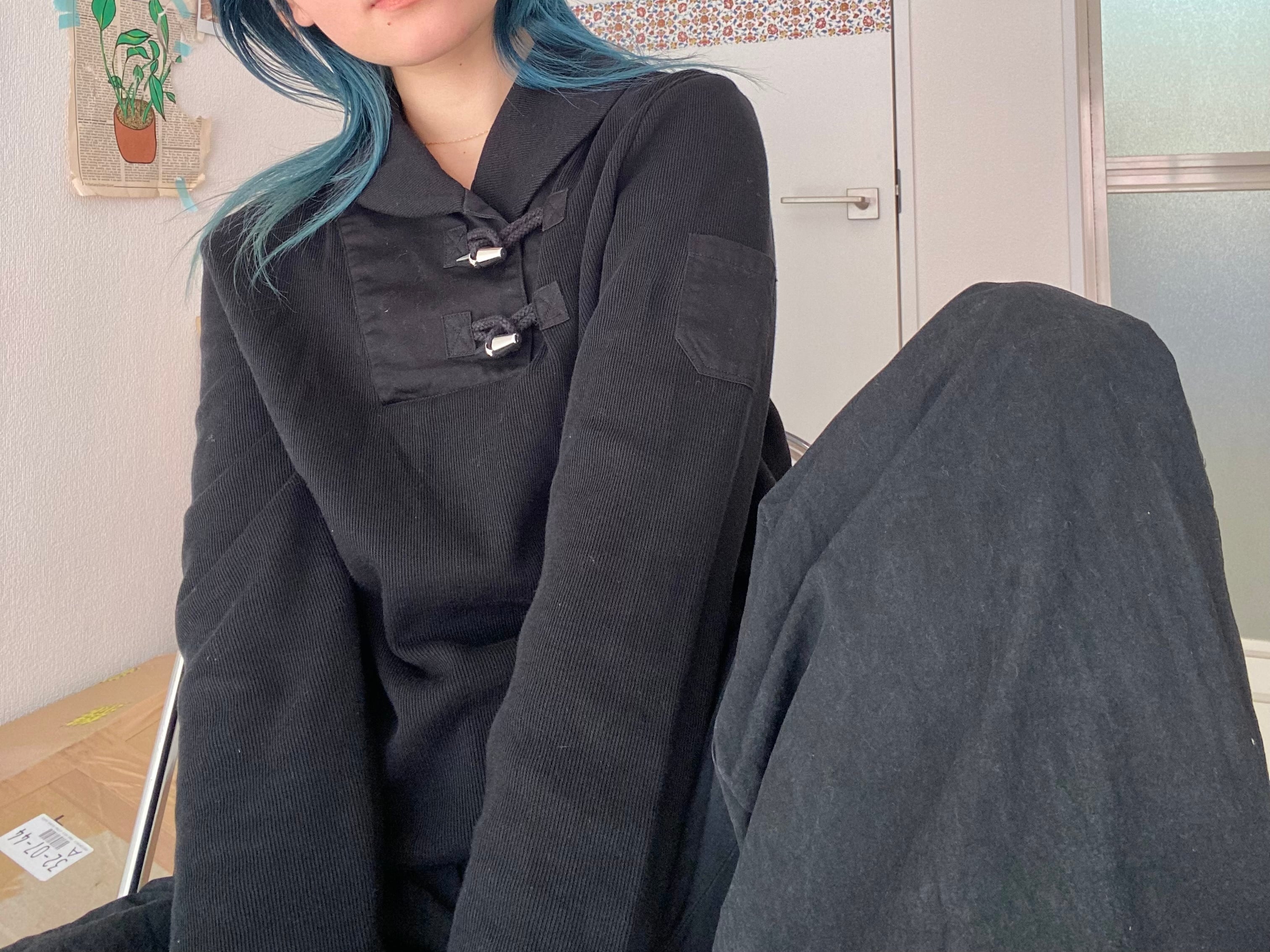 ダッフルボタンが主役のスウェット。袖に付いたポケットがきいてる。カジュアルになりすぎないダッフルボタンのスウェット