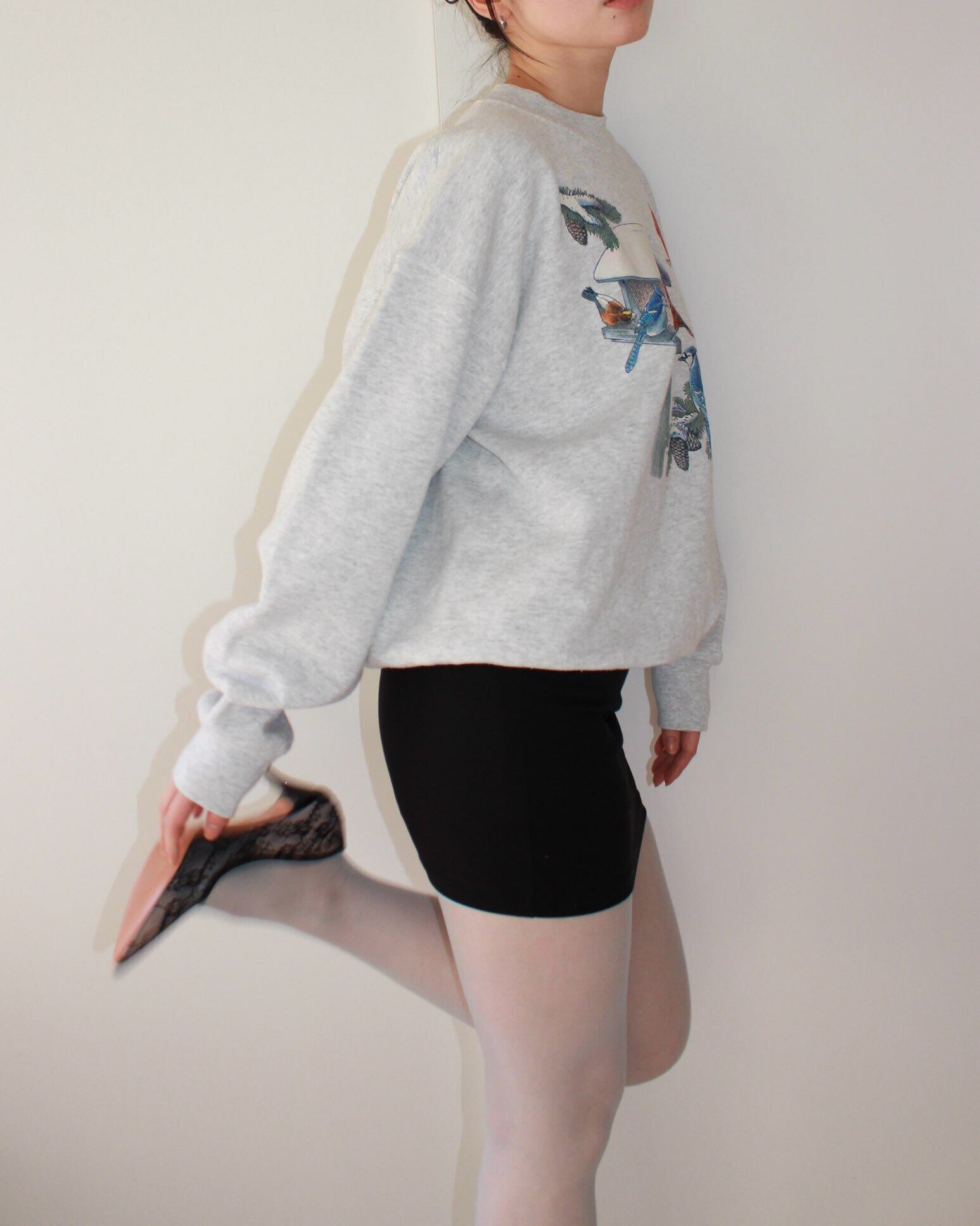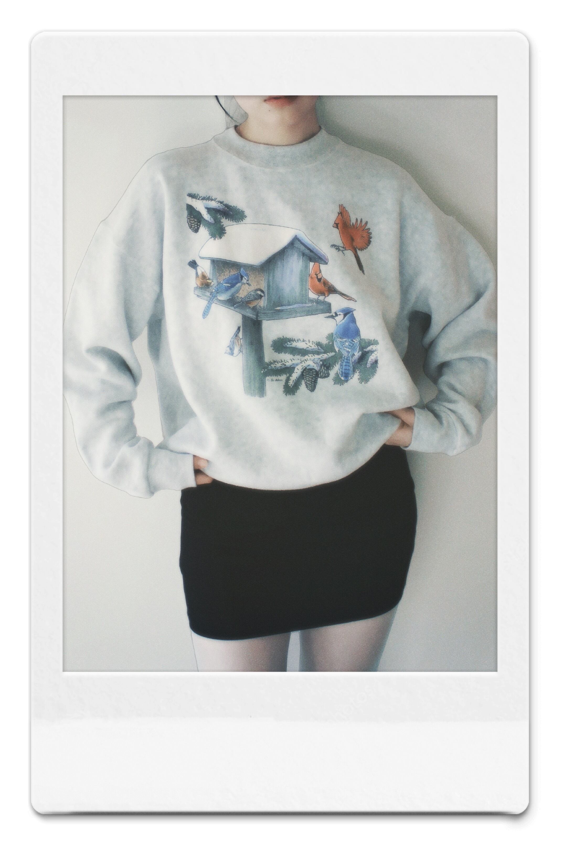 90年代らしいネイチャーモチーフが印象的なスウェット。巣箱に集まる小さな鳥たちのプリントは、どこか絵本の1ページみたいな優しさがあります。